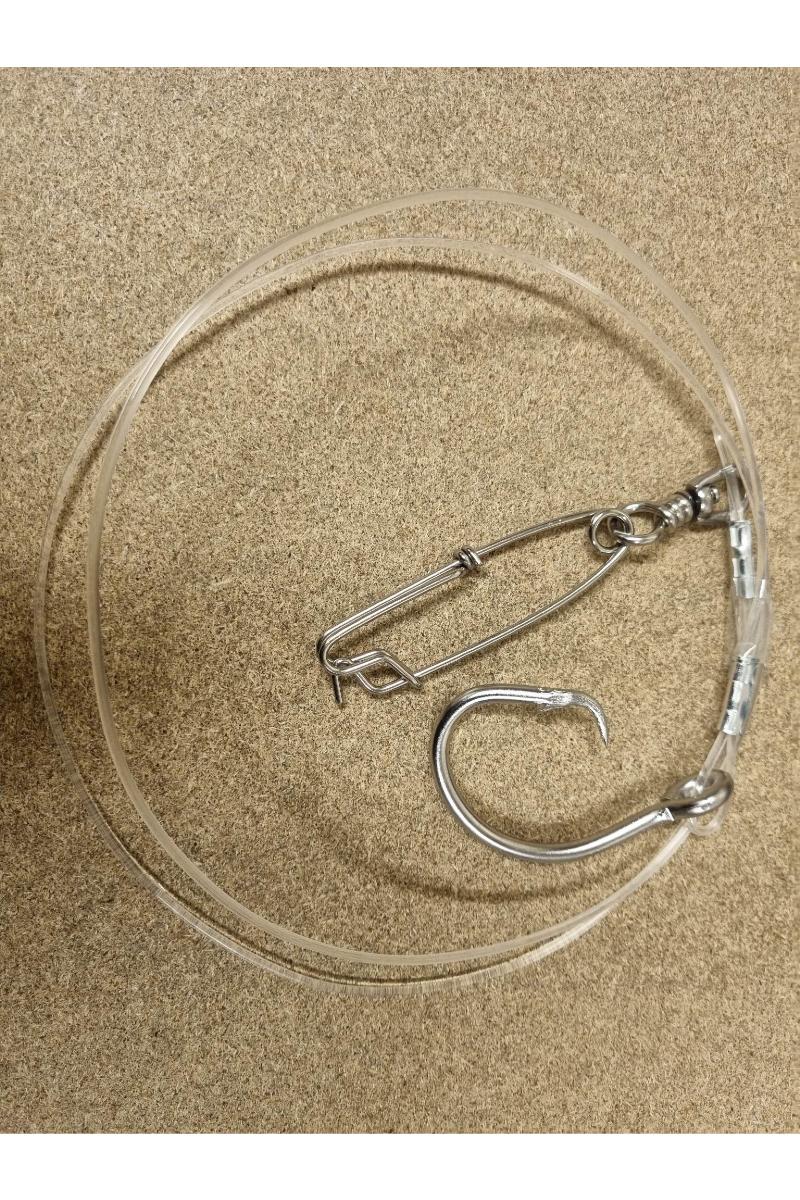 Ferdig kveitvadforsyn klar til bruk på lina. Både krok og klips er satt fast med alu sleeves.